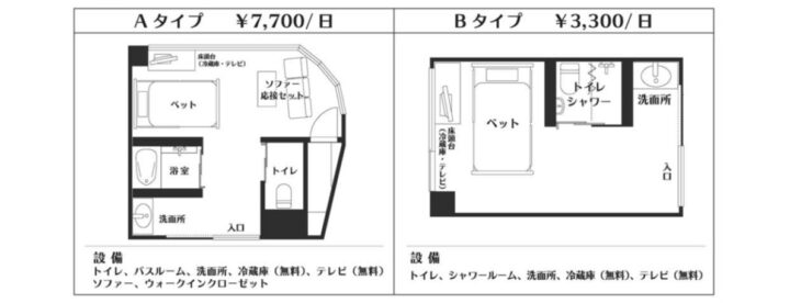 | 設備 | トイレ、バスルーム、洗面所、冷蔵庫(無料)、テレビ(無料)、ソファー(応接セット)、ウォークインクローゼット | トイレ、シャワールーム、洗面所、冷蔵庫(無料)、テレビ(無料) |